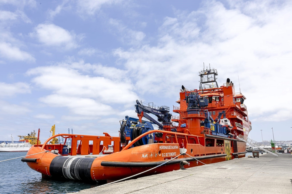 At 82 metres in length with a bollard pull of 213 tonnes, the vessel combines towing, salvage, firefighting (FiFi2), and large-scale oil recovery capability. Equipped with drones for remote surveillance and supported by DP2 positioning, it is built for complex maritime emergencies along Spain’s coastline and offshore zones.